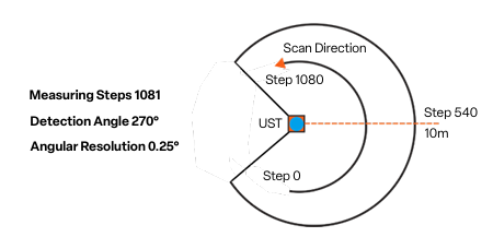 angle_min = -2.356 rad(≈ -135°)angle_max = 2.356 rad(≈ +135°)angle_increment = 0.004363 rad(≈ 0.25° per sample)