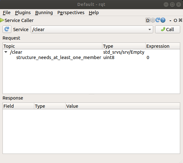 When running rqt for the first time, the window will be blank. No worries; just select Plugins > Services > Service Caller from the menu bar at the top.