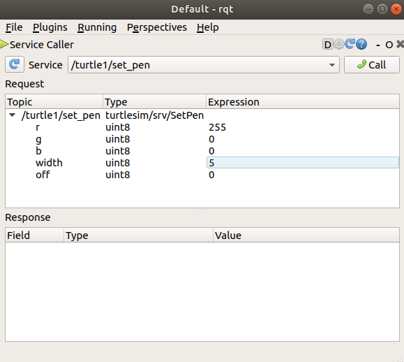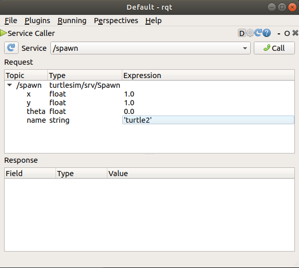 To spawn turtle2, you then need to call the service by clicking the Call button on the upper right side of the rqt window.